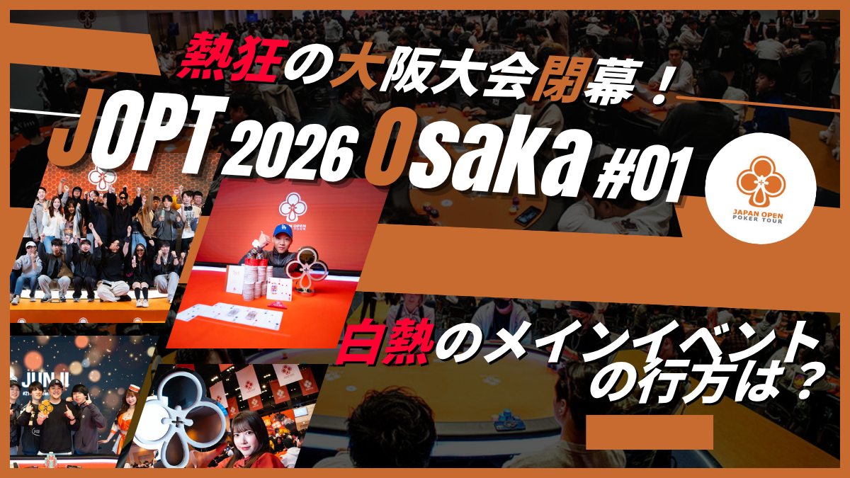 2026年3月18日から22日にかけて、ポーカーを愛する全てのプレイヤーが待ち望んだ「JOPT 2026 Osaka #01」が開催されました。 大阪の地で繰り広げられる熱い戦いの数々。この記事では、会場の様子や各イベントの結果、そして会場を彩る著名人プレイヤーたち... -