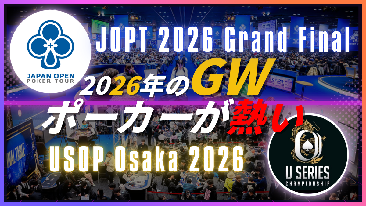 2026年のGWは、日本のポーカーシーンを二分する超大型イベントが東西で開催されます。 東は、東京・ベルサール高田馬場で開催されるJOPT 2026 Grand Final。対する西は、大阪・堂島リバーフォーラムで開催されるUSOP Osaka 2026です。 「どちらの大会に参... -