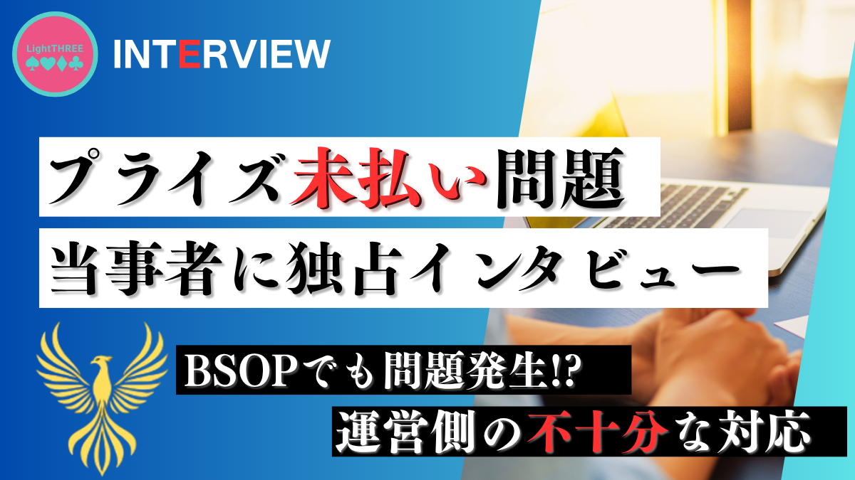 ポーカー大会において、入賞者に支払われるプライズは、競技としての信頼を支える重要な要素です。 しかし現在、国内の一部大会において、入賞後もプライズが支払われないまま数か月が経過している事例が複数浮上しています。 今回は、実際に当該大会に参... -