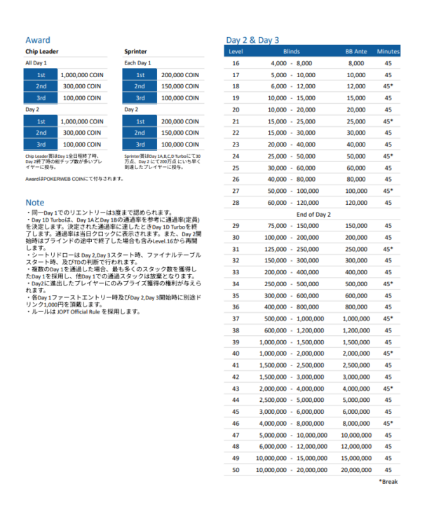また、チケット2枚で25,000点、4枚で50,000点と、チケット枚数に応じてスタートスタックが変動するので、サテライト等で多く確保できた場合、より有利な条件で参加できる仕組みです。