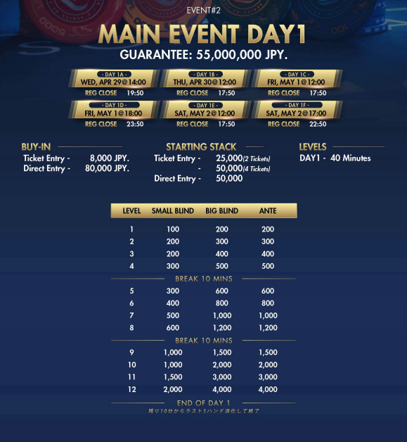 | 日程 | Day 1A:05.02(土) / 11:00 開始 / 18:15締切 Day 1B:05.02(土) / 18:00 開始 / 25:15締切 Day 1C:05.03(日) / 11:00 開始 / 18:15締切 Day 1D Turbo:05.03(日) / 18:00 開始 / 21:10締切 Day 2:05.04(月) / 11:00 開始 Day 3:05.05(火) / 11:00 開始 |