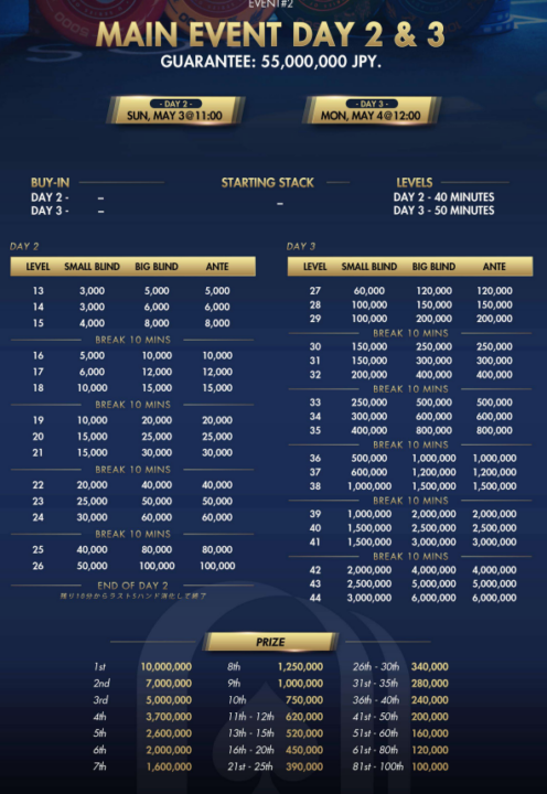 1,000万円の保証が掲げられており、メインイベント同様のストラクチャーや雰囲気でポーカーができるトーナメントです。