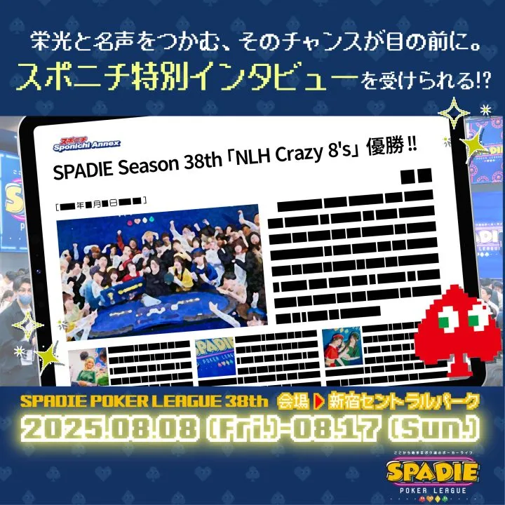 8/12に開催されるSPADIEの『NLH Crazy 8’s sponsored by スポニチ』に抽選で30名様を無料ご招待!!