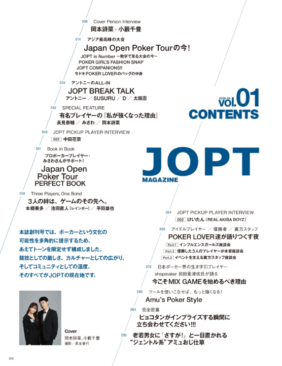 なかでも、『JOPT MAGAZINE』の表紙を飾った岡本詩菜さんと小籔千豊さんの対談では、お互いの印象から始まり、2人のポーカーを始めたきっかけ、ポーカーのスキルアップ方法など興味深いエピソードが語られています。