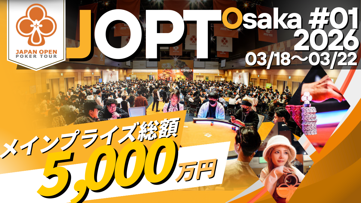 JOPT 2026 Osaka #01は、2026年春のポーカーシーンの幕開けを華々しく飾り、メインイベントをはじめ、多彩なサイドイベントやキャンペーンが、あなたを待っています。