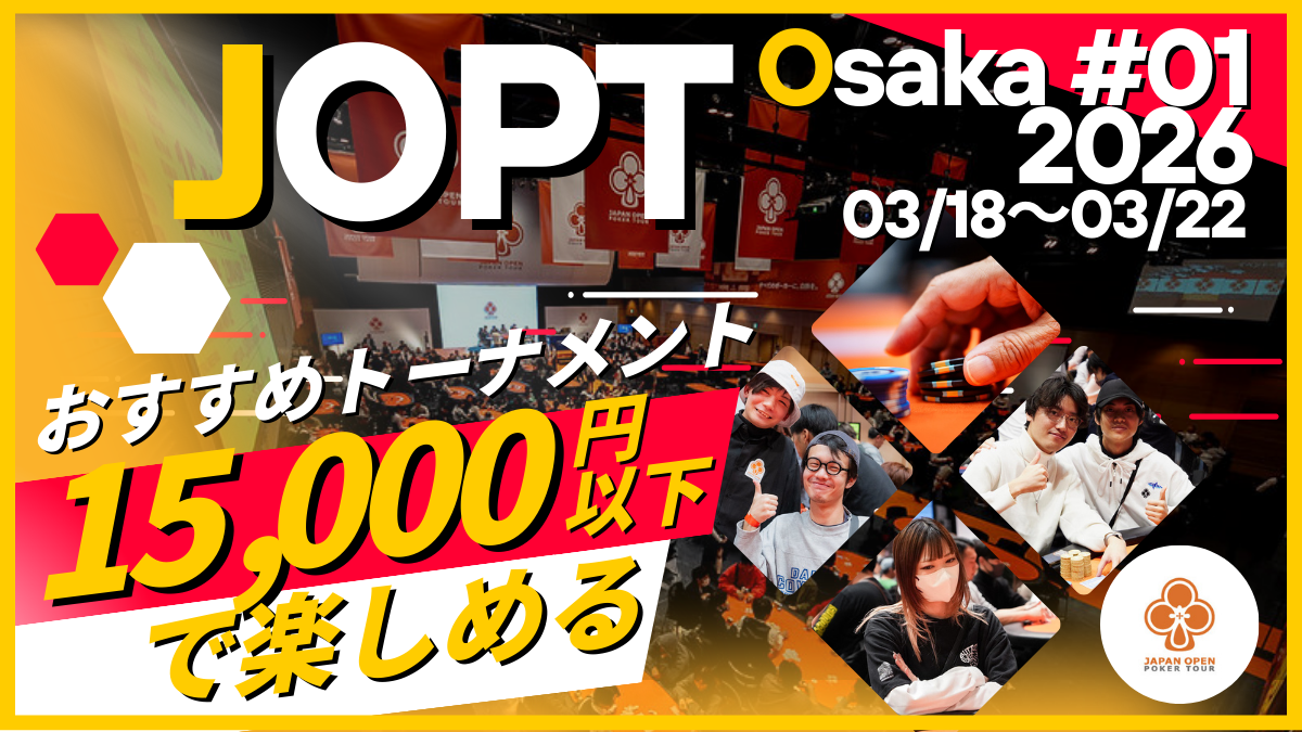 「JOPT 2026 Osaka #01」は15,000円以下で楽しめる定番のNLHから、一発逆転の夢があるサテライトまで、本当に多彩なイベントが揃っています。