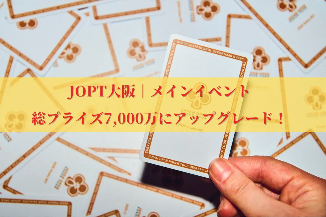日本最大級のポーカートーナメントJapan Open Poker Tourが、新たな歴史の扉を開きました。 次回「JOPT大阪」のメインプライズ総額を3,000万円から2倍以上増の7,000万円へと引き上げることがJOPTにより発表されました! JOPTがまた一つ、新たな地平を切り... -