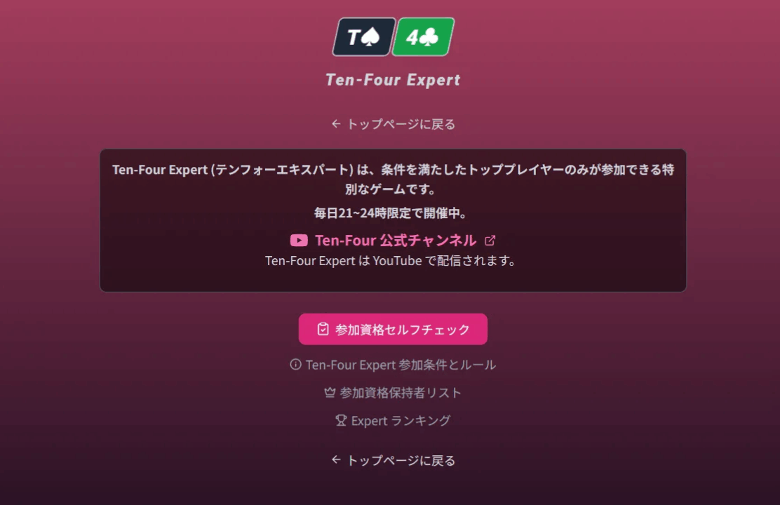 Ten-Four Expertは、一定のプレイ量と成績を満たしたプレイヤーのみが参加できる上級者向けモードです。