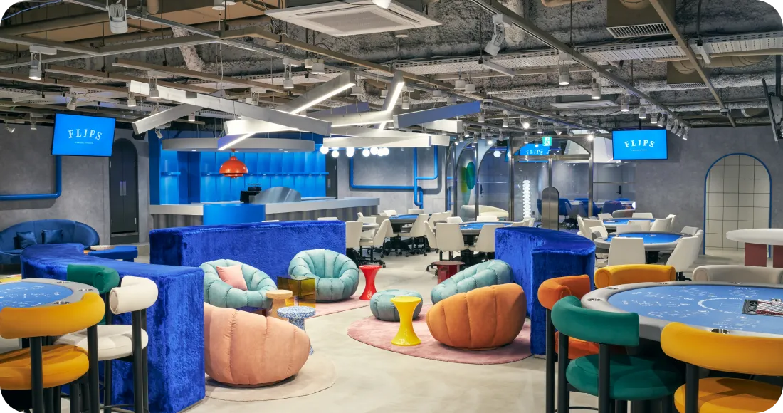 FLIPS 新宿は世界のヨコサワが「日本のポーカーを盛り上げたい!」という気持ちで全国に200店舗以上のゲームセンターを展開する株式会社GENDA GiGO Entertainmentとコラボした、初心者をメインターゲットとしたポーカールームとなっています。
