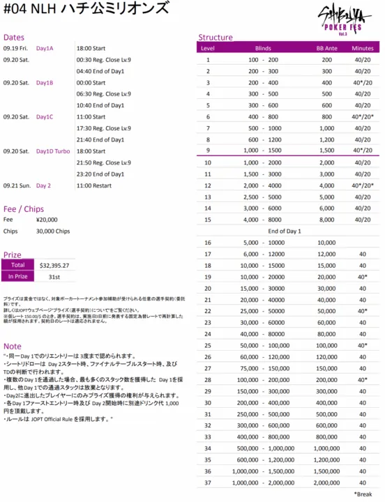 メインイベント以外では唯一の2Day開催で、手軽な参加費ながらも濃厚なポーカー体験ができます。