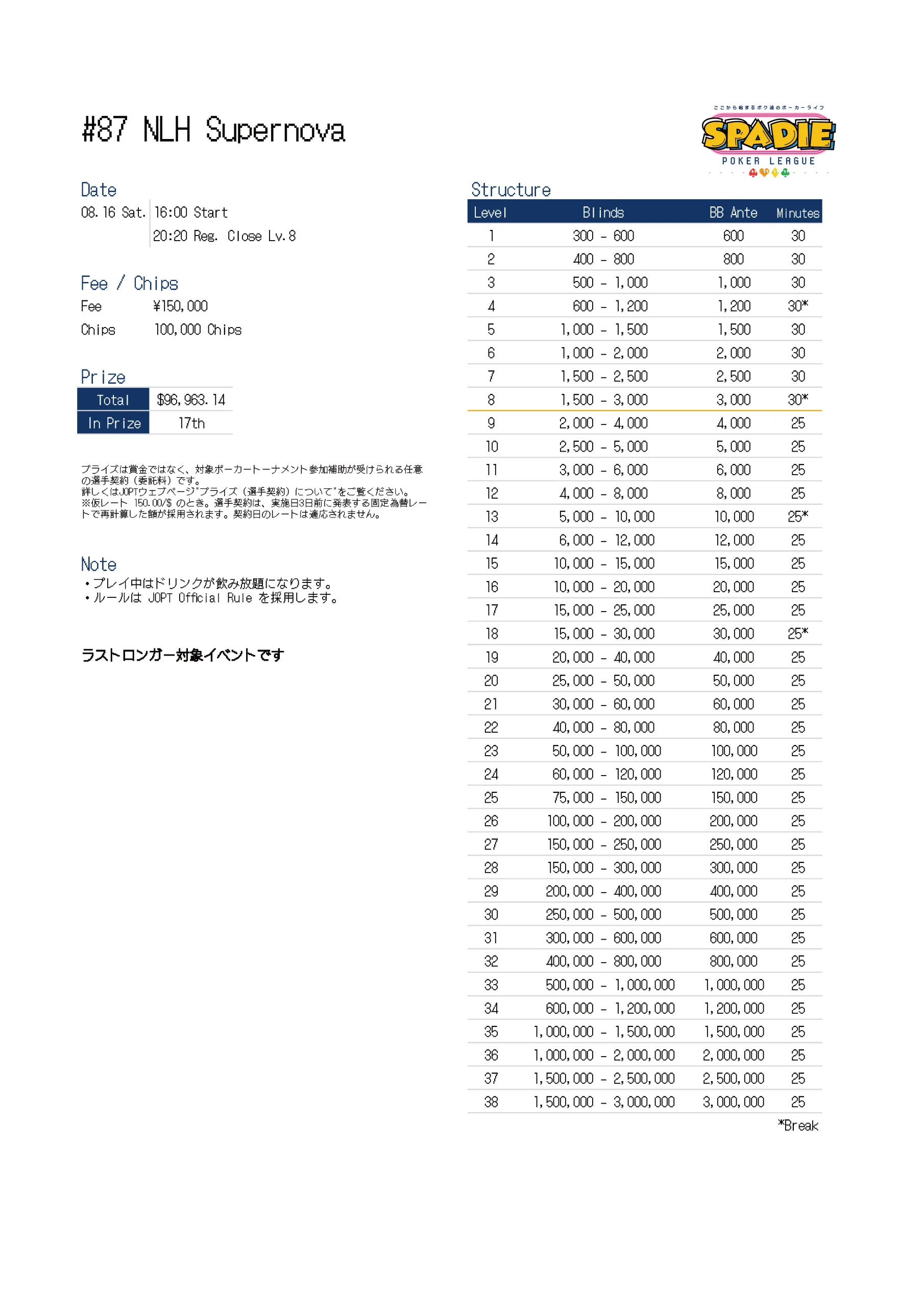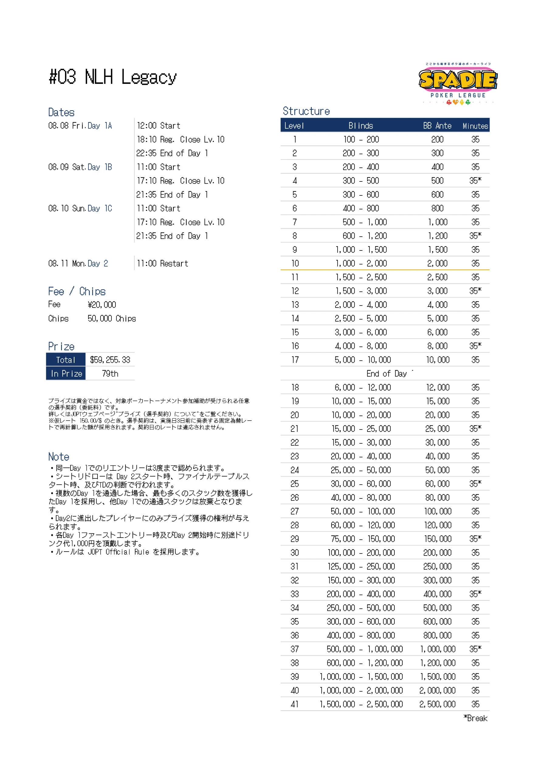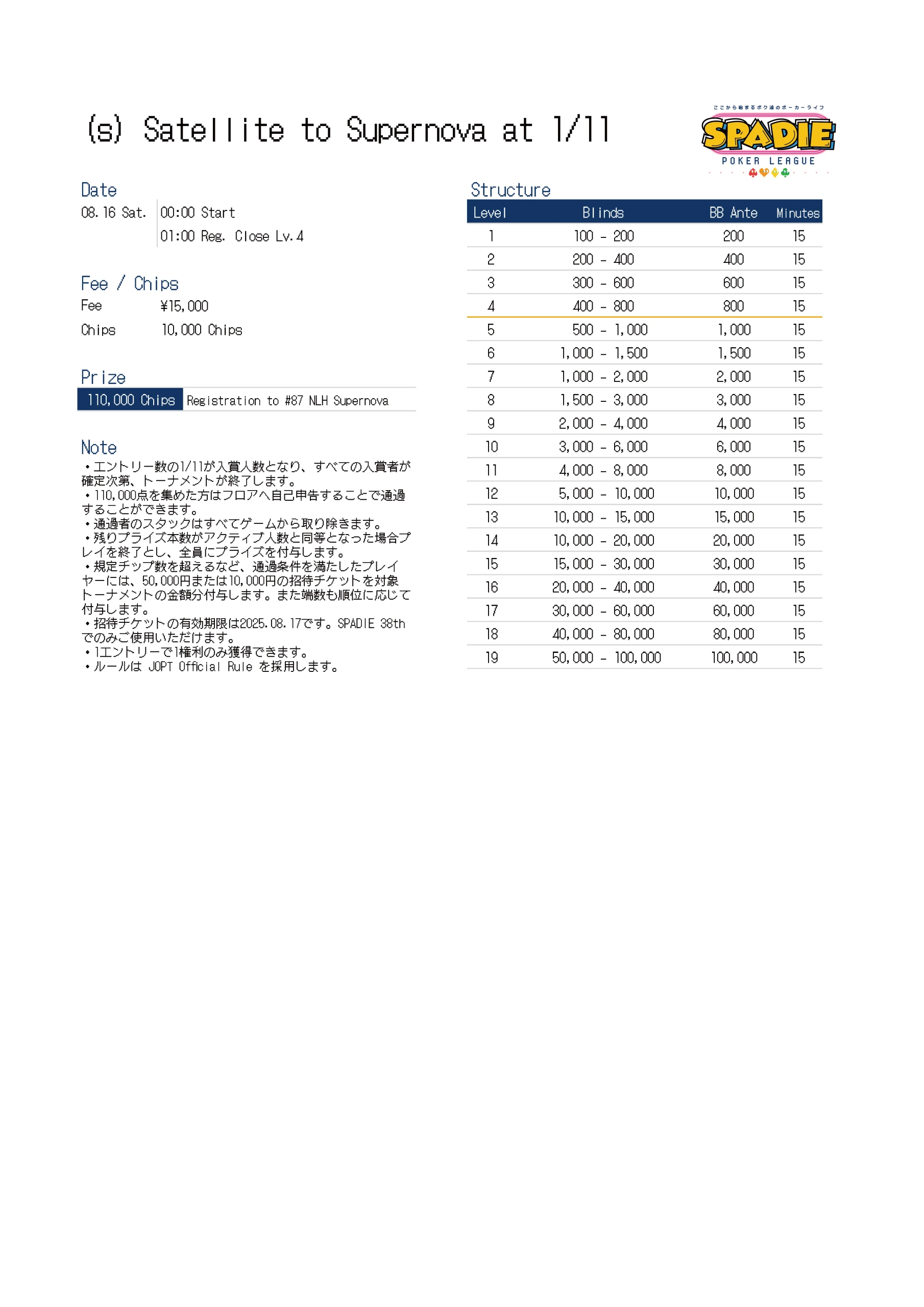 | Main Event Day1B | 2 Tickets + ¥5,000 or ¥80,000 | 08.15(金) 11:00 開始 18:10 エントリー締切 |