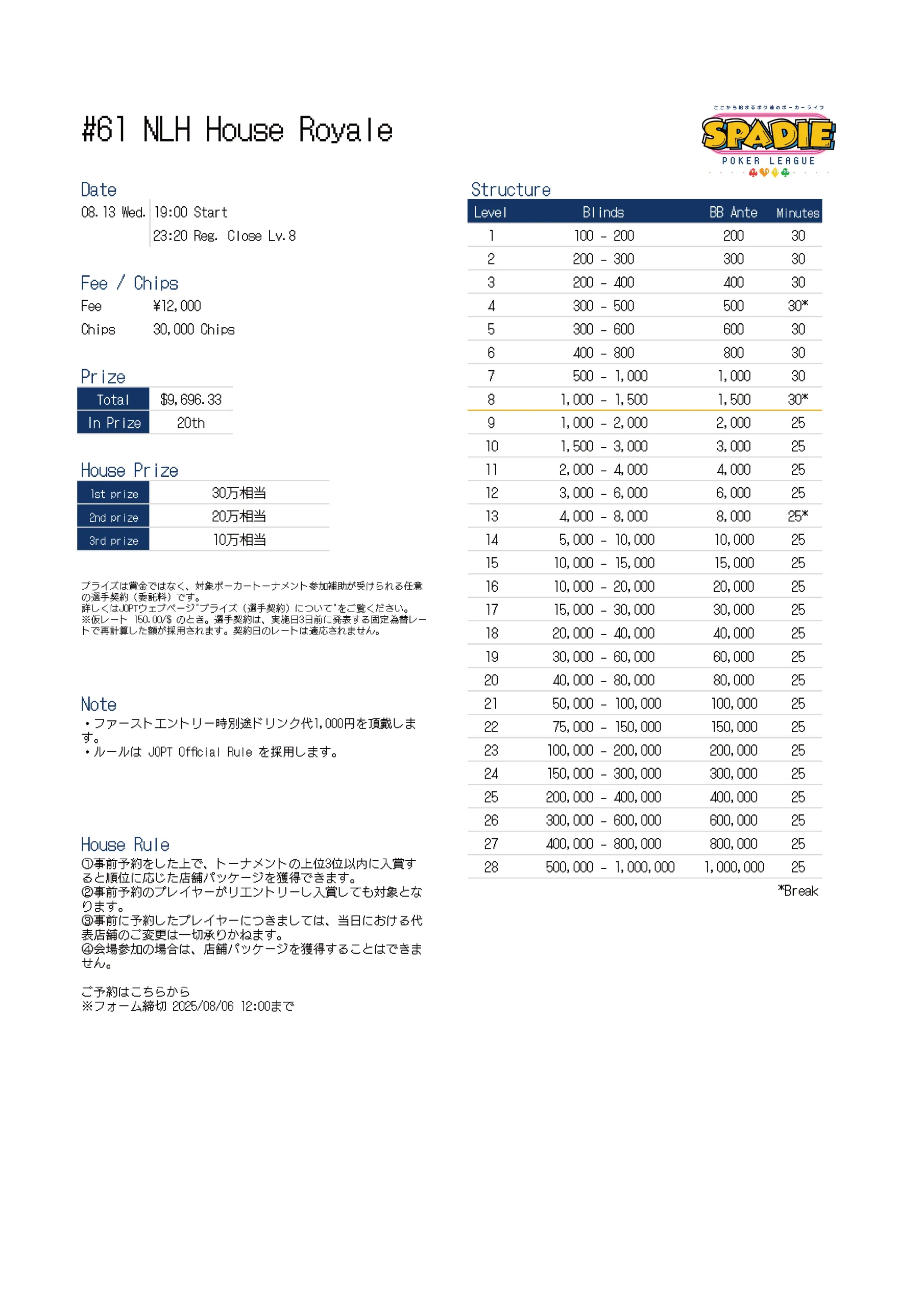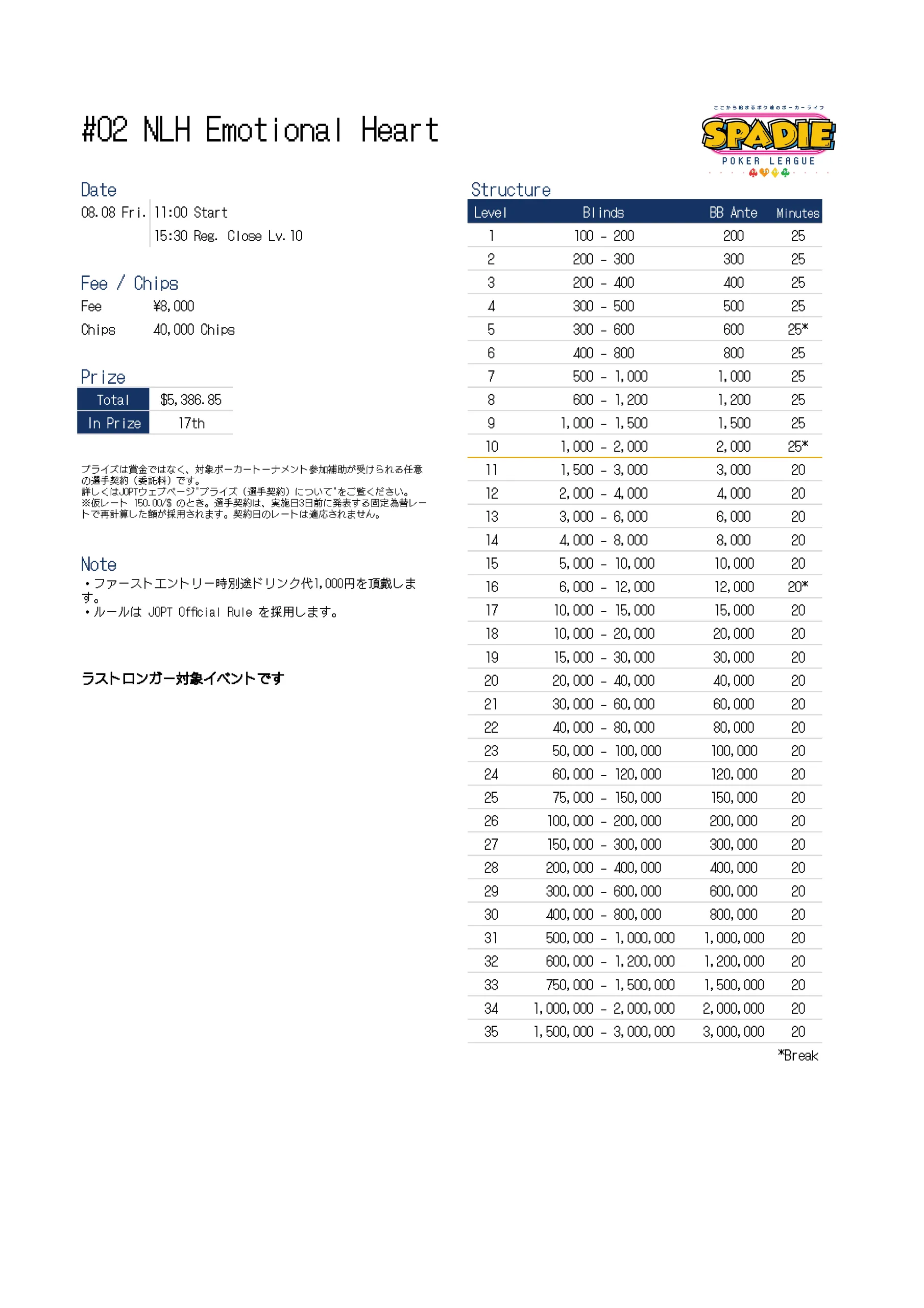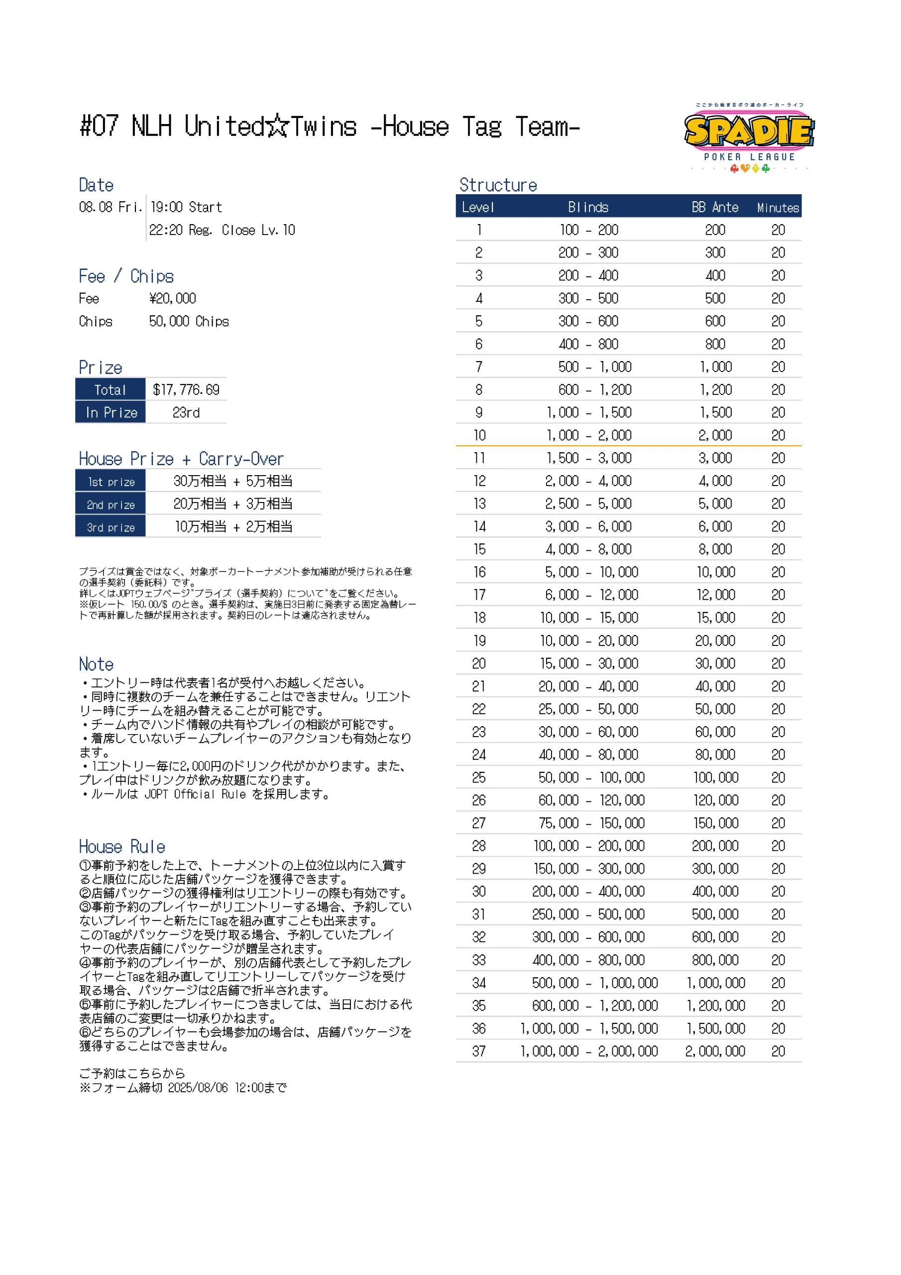 | Main Event Day1B | 2 Tickets + ¥5,000 or ¥80,000 | 08.15(金) 11:00 開始 18:10 エントリー締切 |