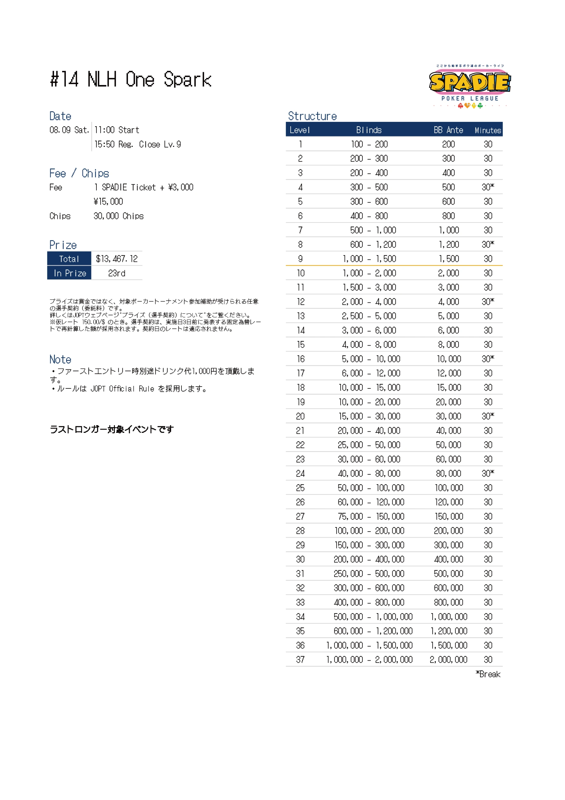 | Main Event Day1A | 2 Tickets + ¥5,000 or ¥80,000 | 08.14(木) 11:00 開始 18:10 エントリー締切 |