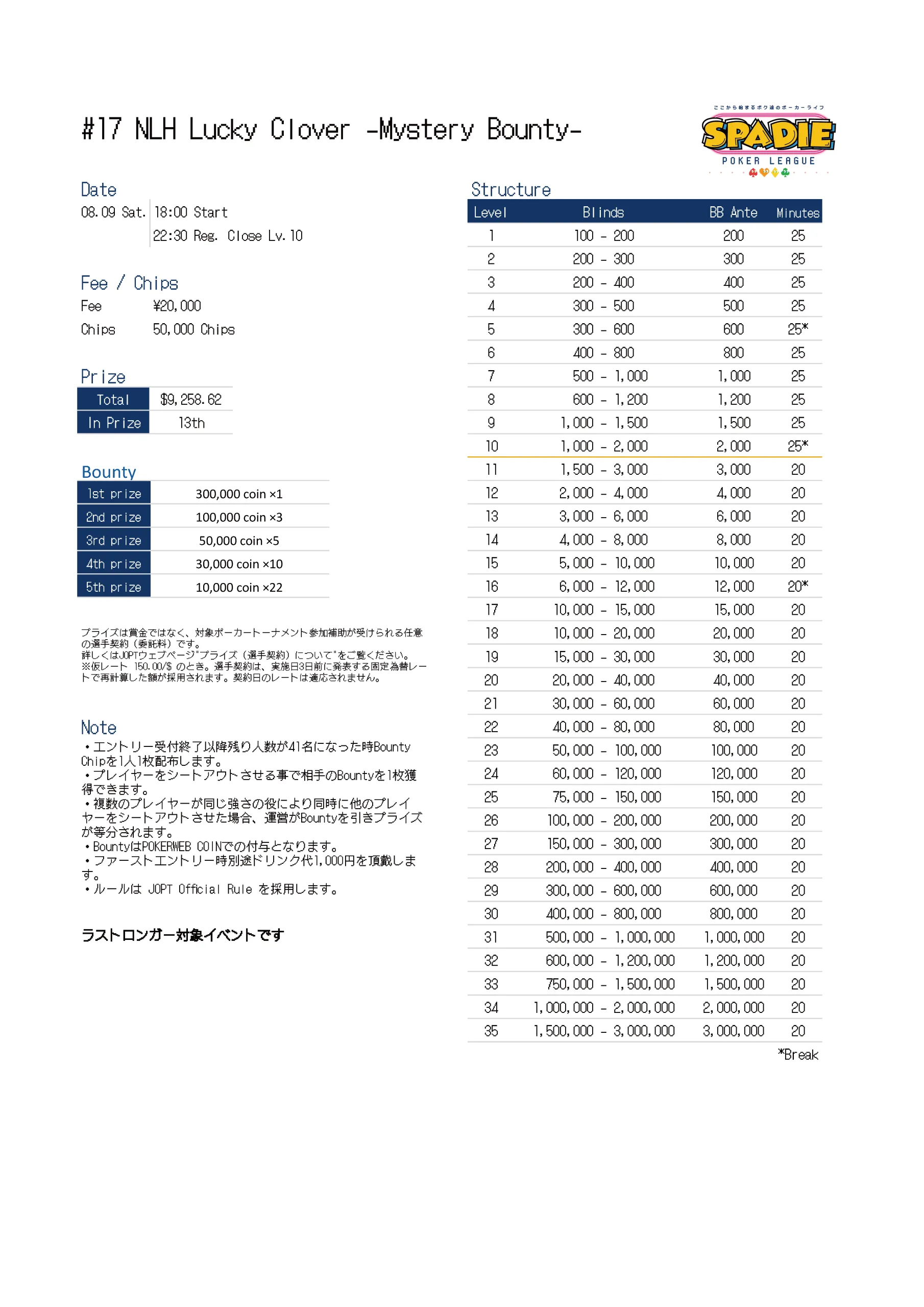 | Lucky Clover -Mystery Bounty- | ¥20,000 | 約135万円 +137万円(バウンティ) | 08.09(土) 18:00 開始 22:30 エントリー締切 |