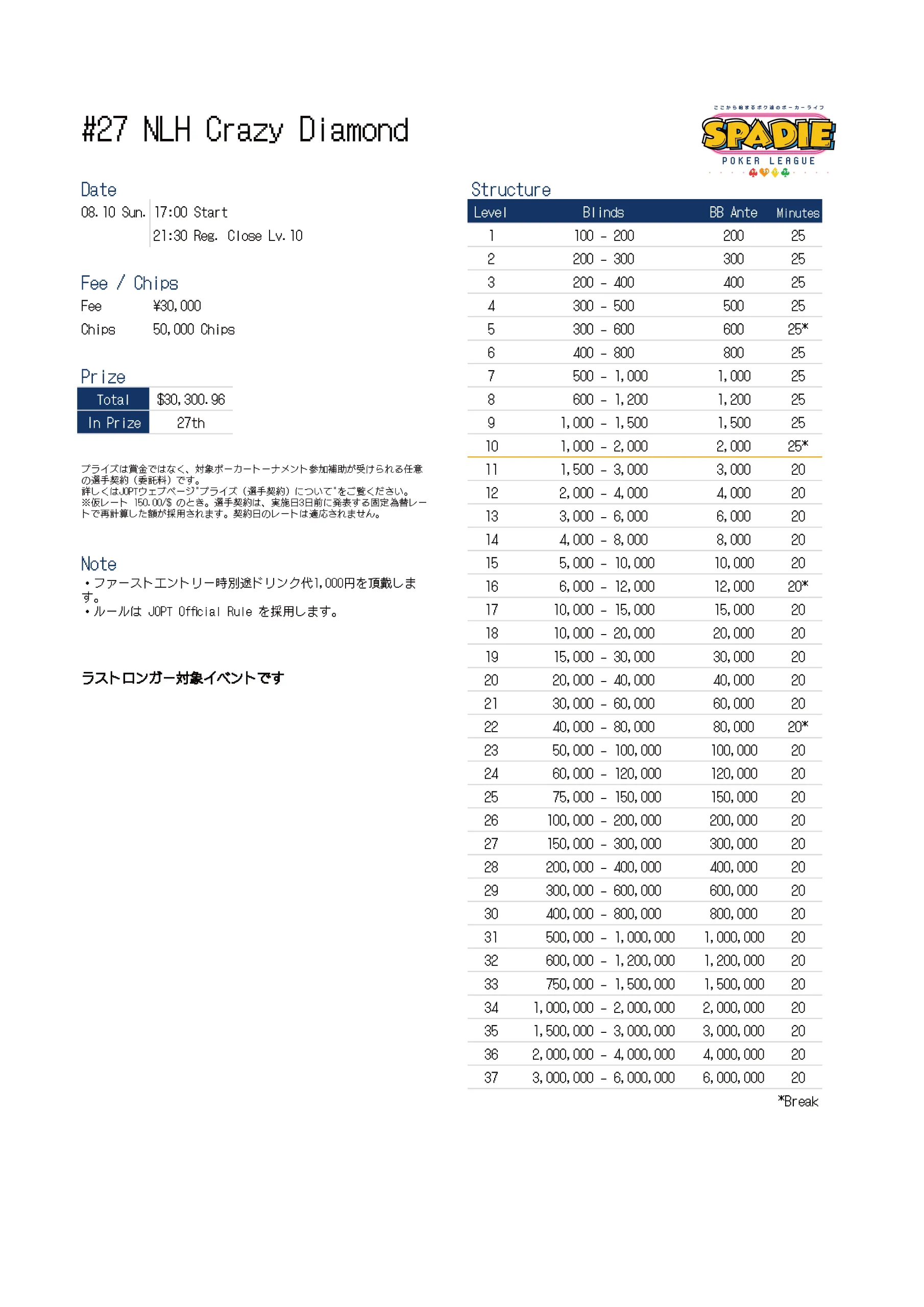 | Crazy Diamond | ¥30,000 | 約440万円 | 08.10(日) 17:00 開始 21:30 エントリー締切 |