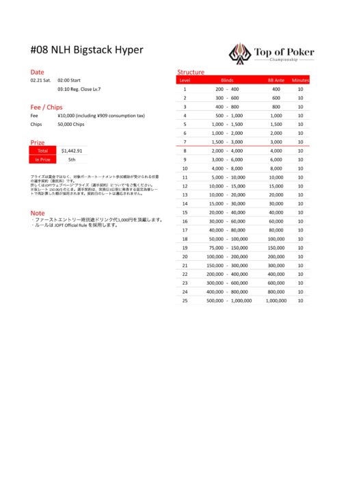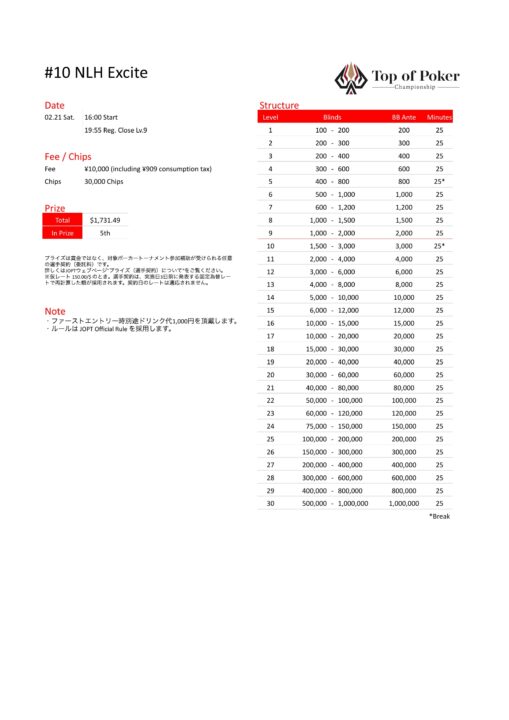 トーナメントの特徴としては、短いストラクチャーのため、スピーディーな展開が予想されます。運の要素も絡みやすいため、初心者の方でも上位入賞のチャンスは十分にあります。