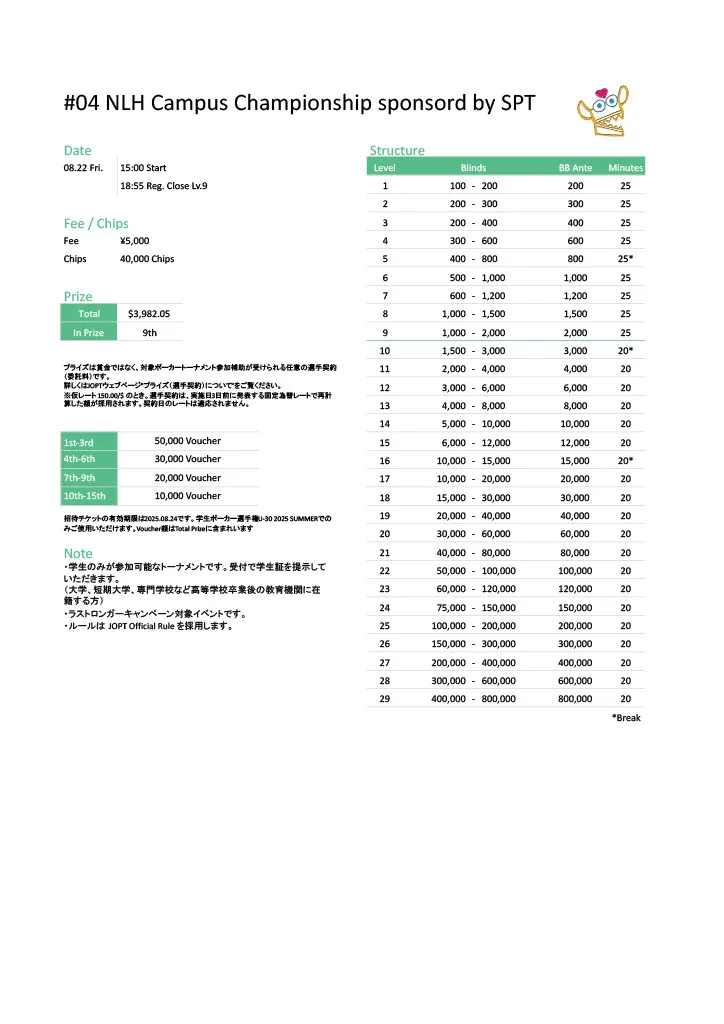 今回は、学生ポーカー団体 Student Poker Tourとのコラボ開催という特別仕様。