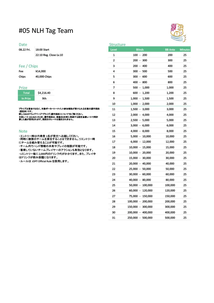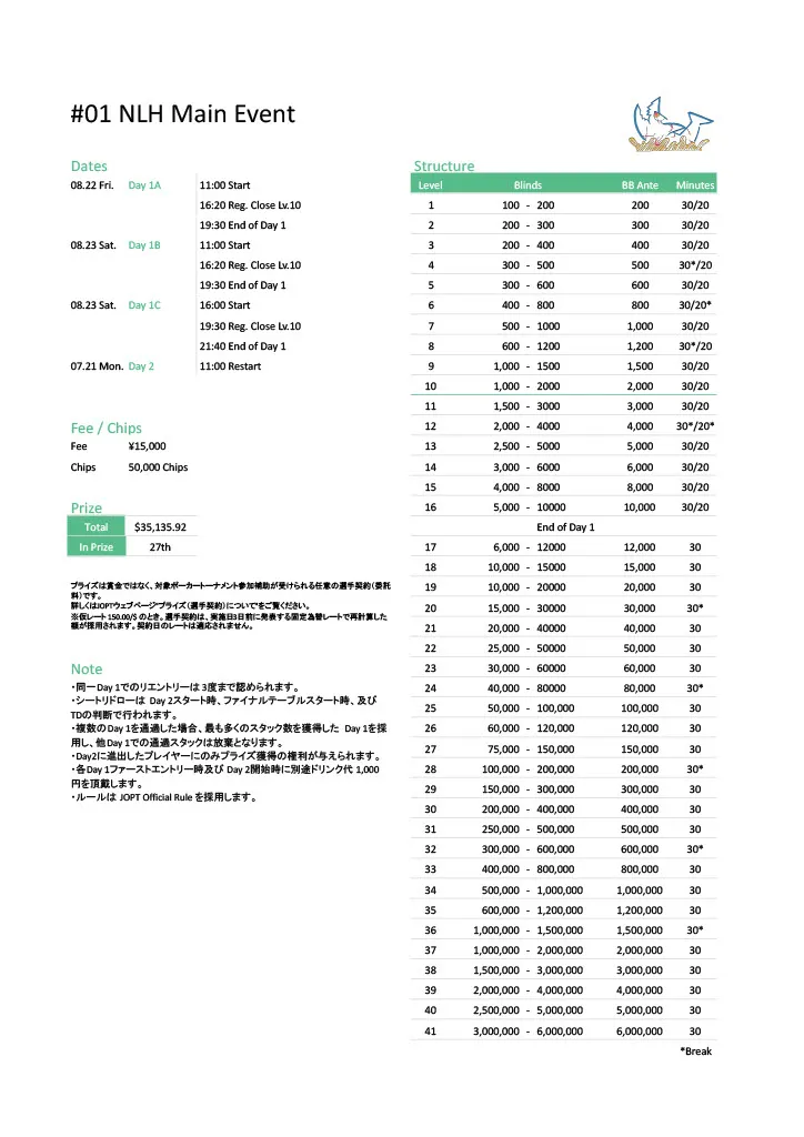 | Main Event Day1A | ¥15,000 | 08.22(金) 11:00 開始 16:20 エントリー締切 |