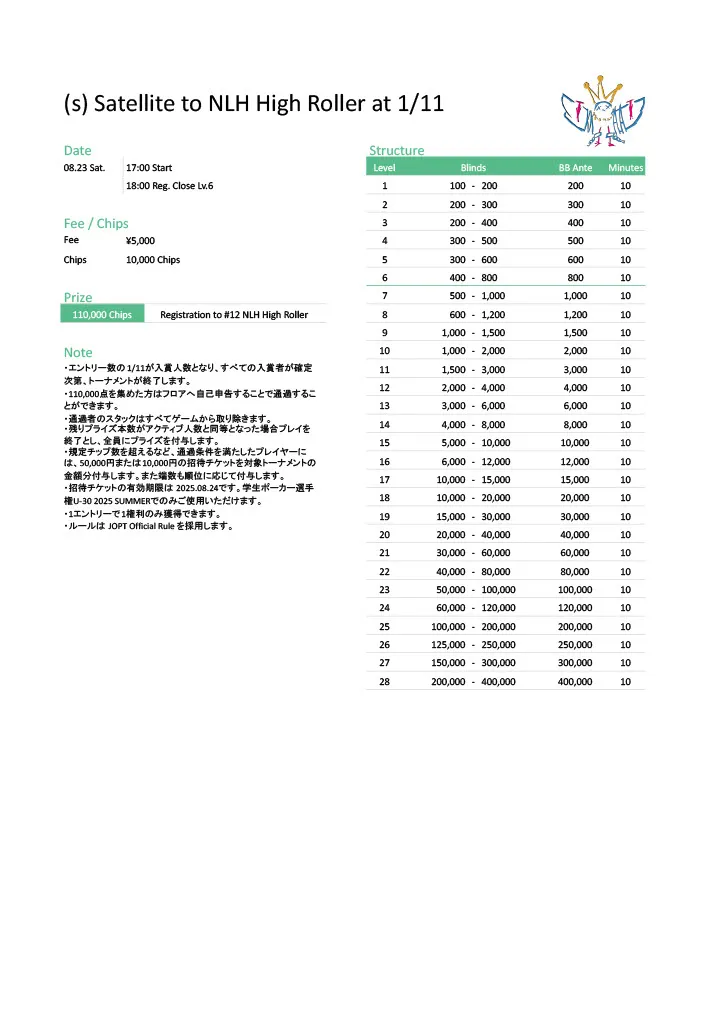 | Main Event Day2 | *Day1通過者のみ | 08.24(日) 11:00 Day2 開始 |