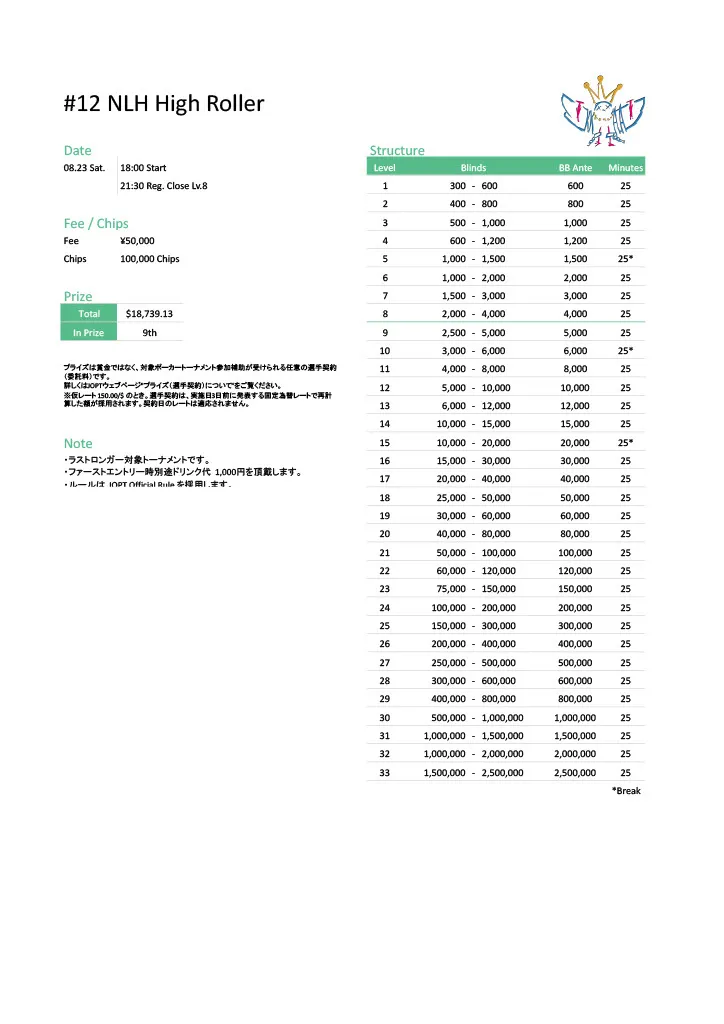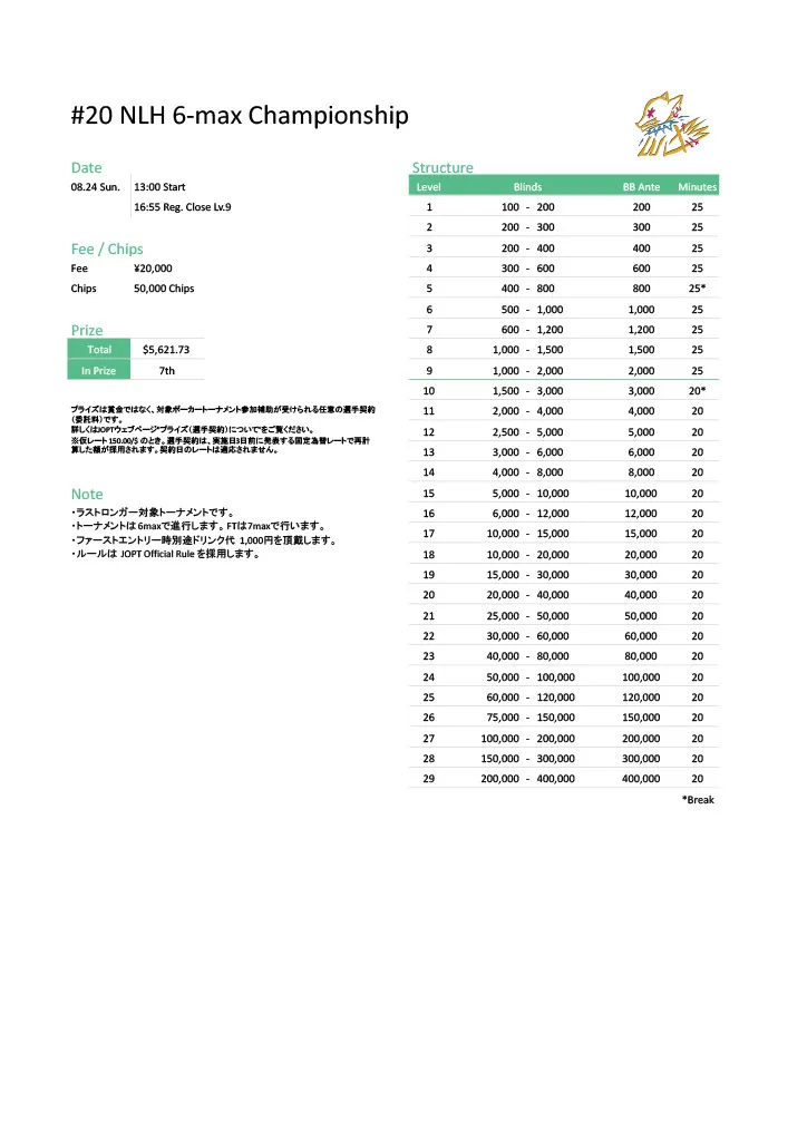 | Main Event Day1B | ¥15,000 | 08.23(土) 11:00 開始 16:20 エントリー締切 |