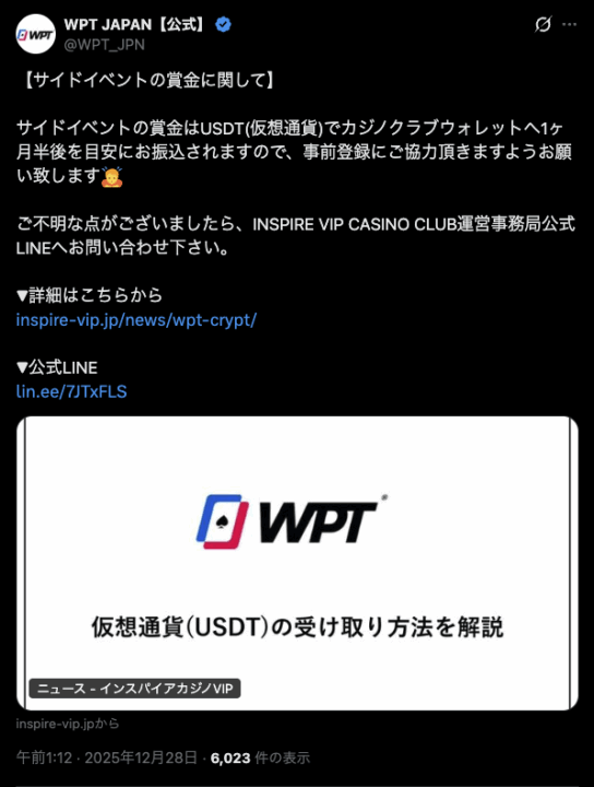 — WPT JAPAN【公式】 (@WPT_JPN) December 29, 2025